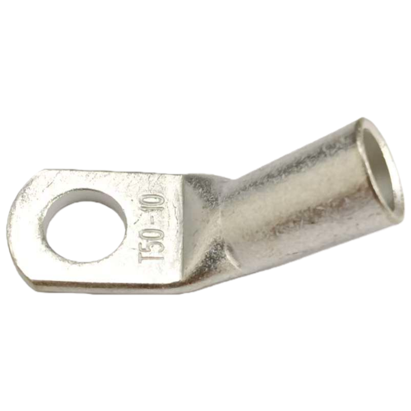 Heavy-duty T45-50/10 copper tube terminal with a 45-degree angle offset. Designed for 1/0 AWG (50mm²) cables and 10.5mm (M10) studs. Ideal for tight-space battery and inverter connections with corrosion-resistant tin plating.