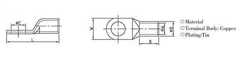 Item No.Wire Range (mm²/AWG)ΦE (mm) Stud HoleΦD (mm)φd (mm)W (mm) WidthB (mm) BarrelL (mm) Total